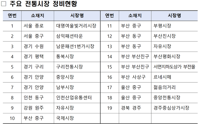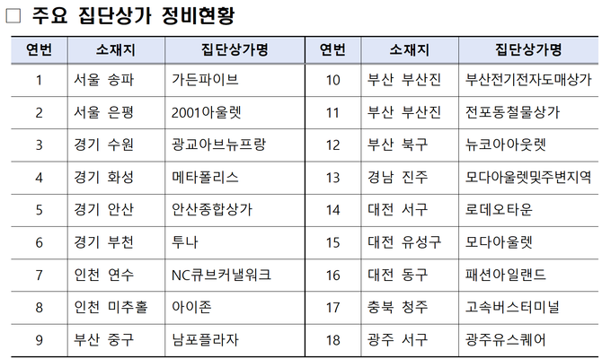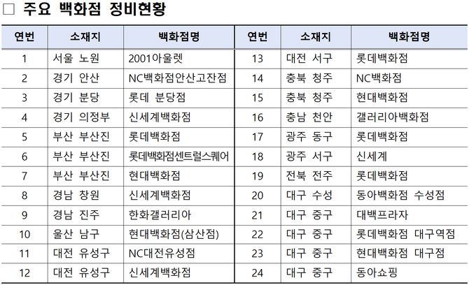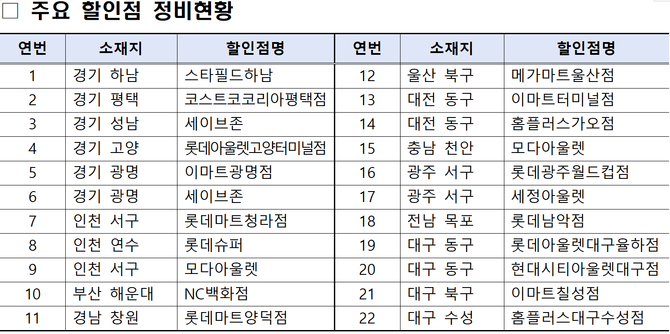 유형별 허용 사업장은 전통시장 총 182개 중 98개, 비수도권 전통시장 82개 중 57개, 집단상가・할인점 총 728개 중 317개, 비수도권 270개 중 191개, 호텔, 백화점 입점 사업자 총 266개 중 129개다.