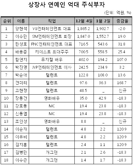 최근 월드스타 싸이 등과 재계약에 성공한 양현석 YG엔터테인먼트 대표는 이 날 1천865억2천만원을 기록해 1위를 지켰다.