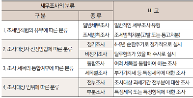 과세관청이 실시하는 세무조사는 여러 가지 관점에서 분류해 볼 수 있는데, 실제 실시되고 있는 실무적인 측면에서 요약하여 분류하면 아래와 같다.