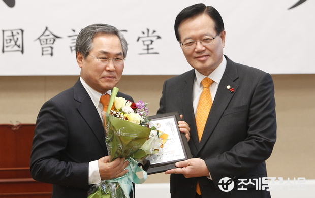 (조세금융신문=전한성 기자) '제17회 백봉신사상 시상식'이 8일 오전 서울 여의도 국회 귀빈식당에서 열린 가운데 새정치민주연합 우윤근(왼쪽) 전 원내대표가 베스트10을 수상하고 정의화 국회의장과 기념촬영을 하고 있다.