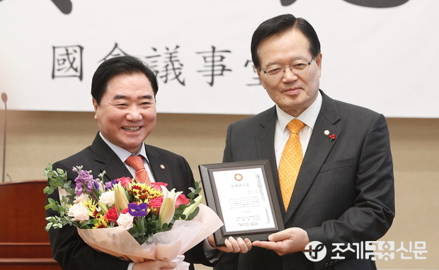 (조세금융신문=전한성 기자) '제17회 백봉신사상 시상식'이 8일 오전 서울 여의도 국회 귀빈식당에서 열린 가운데 이석현(왼쪽) 국회 부의장이 베스트10을 수상하고 정의화 국회의장과 기념촬영을 하고 있다.