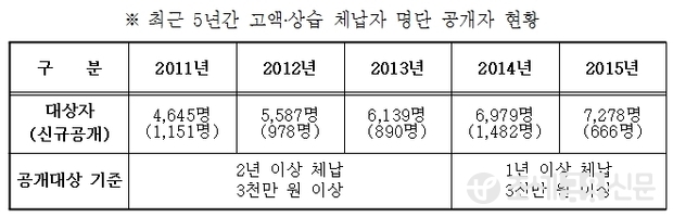 이번에 명단이 공개된 총 7,278명 가운데 올해 처음으로 명단에 오른 신규 공개자는 666명이며 총 체납액은 1,028억 원이다.