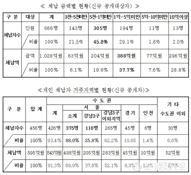신규 명단공개 대상자의 1인당 평균 체납액은 1억5천만 원이며, 개인이 456명에 체납액 595억 원, 법인이 210명에 체납액 433억 원이었다.