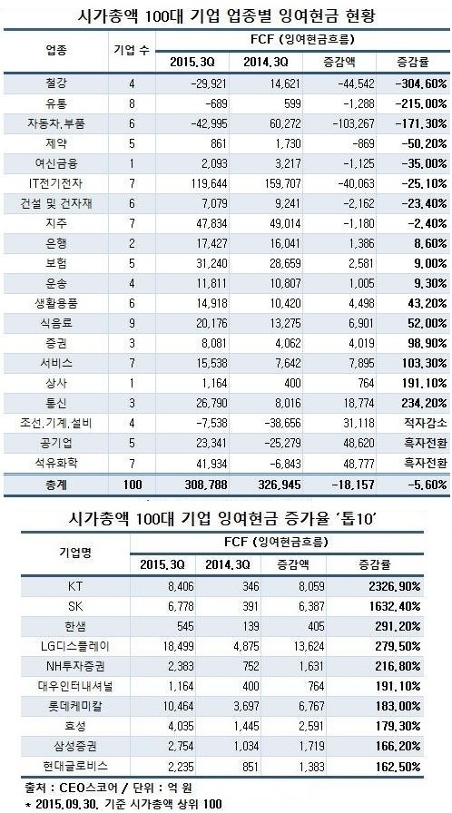 기업별로는 KT, SK, 한샘, LG디스플레이, NH투자증권, 대우인터내셔널, 롯데케미칼, 효성, 삼성증권, 현대글로비스 등이 잉여현금 증가율 ‘톱10’을 기록했다.