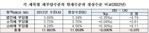 한편 법인세, 소득세, 소비세 등 3개 세목에 대한 세부담을 현재수준에서 정상수준으로 조정할 경우, 조세부담률의 합계는 11.658%로 2012년 세부담률 11.663%과 큰 차이가 없었다.