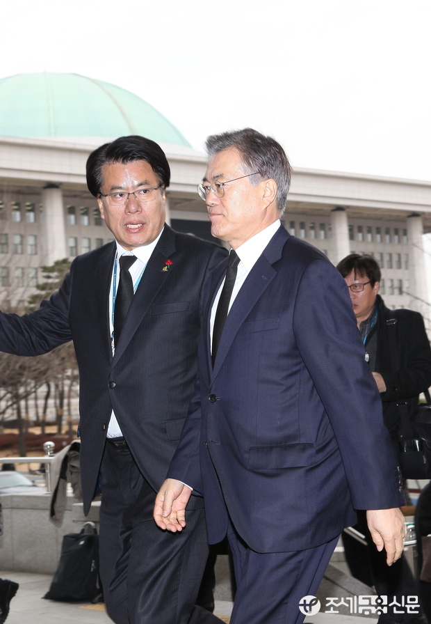 (조세금융신문=전한성 기자) 고(故) 이만섭 전 국회의장의 국회장 영결식이 18일 오전 서울 여의도 국회 의원회관에서 엄수된 가운데 새정치민주연합 문재인(오른쪽) 대표가 영결식장에 들어서고 있다.