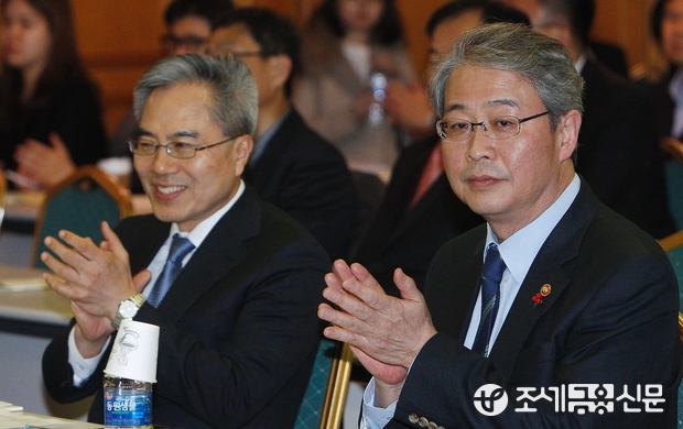 (조세금융신문=전한성 기자) '금융개혁 현장점검 성과보고회'가 21일 오후 서울 중구 명동 은행회관에서 열린 가운데 임종룡(오른쪽) 금융위원장과 하영구 전국은행연합회장이 박수를 치고 있다.