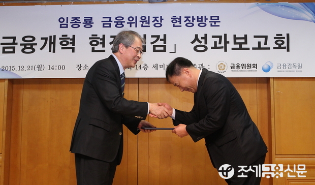 (조세금융신문=전한성 기자) '금융개혁 현장점검 성과보고회'가 21일 오후 서울 중구 명동 은행회관에서 열린 가운데 임종룡(왼쪽) 금융위원장이 수상자에게 시상을 하고 있다.
