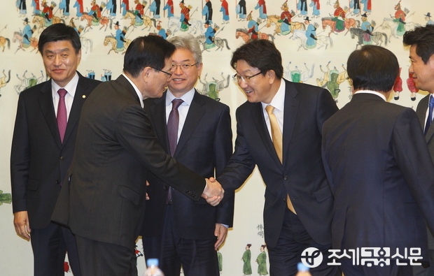 (조세금융신문=전한성 기자) 국회의장 주재 쟁점법안 관련 회의가 22일 오전 서울 여의도 국회 접견실에서 열린 가운데 정의화(왼쪽) 국회의장이 새누리당 권성동 간사와 악수 나누고 있다.