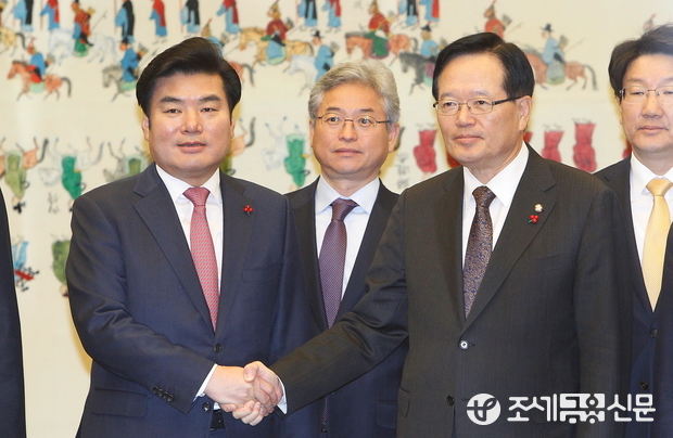 (조세금융신문=전한성 기자) 국회의장 주재 쟁점법안 관련 회의가 22일 오전 서울 여의도 국회 접견실에서 열린 가운데 정의화(오른쪽) 국회의장이 새누리당 원유철 원내대표와 악수 나누고 있다.