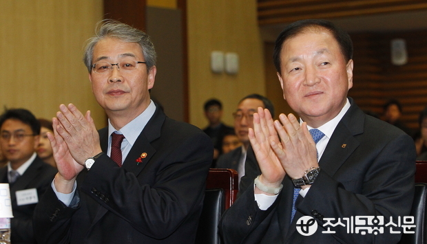 (조세금융신문=전한성 기자) '2015 서민금융의 날 시상식'이 22일 오후 서울 중구 NH농협은행 본점에서 열린 가운데 임종룡(왼쪽) 금융위원장과 김주하 NH농협은행장이 박수를 치고 있다.