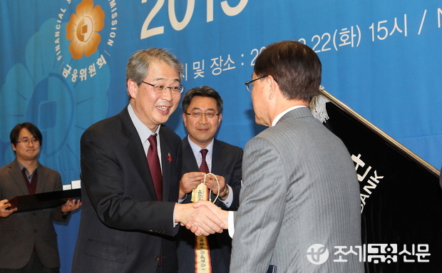 (조세금융신문=전한성 기자) '2015 서민금융의 날 시상식'이 22일 오후 서울 중구 NH농협은행 본점에서 열린 가운데 임종룡(왼쪽) 금융위원장이 표창장을 수여한 후 악수를 나누고 있다.
