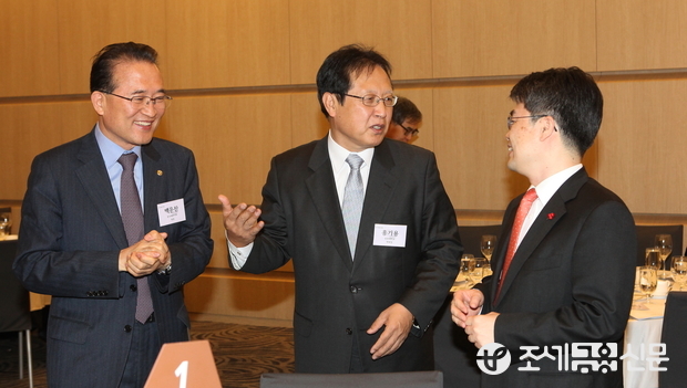 (조세금융신문=전한성 기자) '한국세무학회 2015년 후원감사송년회 및 시상식'이 26일 오후 서울 서초구 더팔레스호텔에서 열린 가운데 백운찬(왼쪽부터) 한국세무사회장과 홍기용 한국세무학회장, 박형수 조세재정연구원장이 대화 나누고 있다.