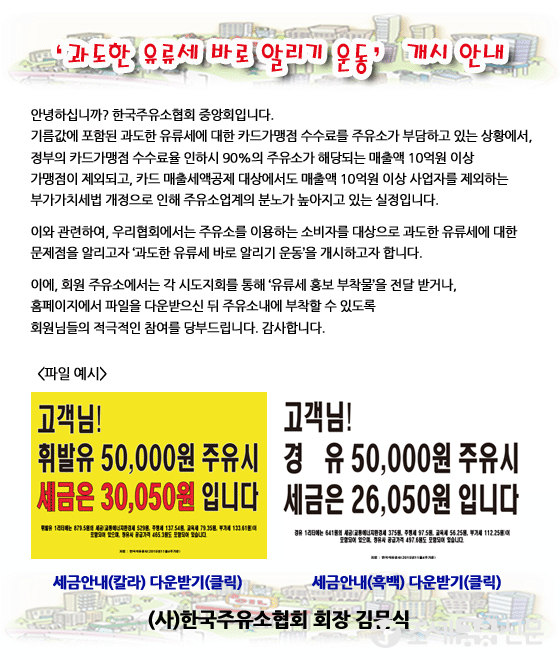 주유소협회는 현재 "휘발유 5만원 주유시 세금이 3만50원입니다"라는 현수막을 전국 주유소에 걸어놓고 '유류세 바로 알리기 운동'에 돌입한 상태다.