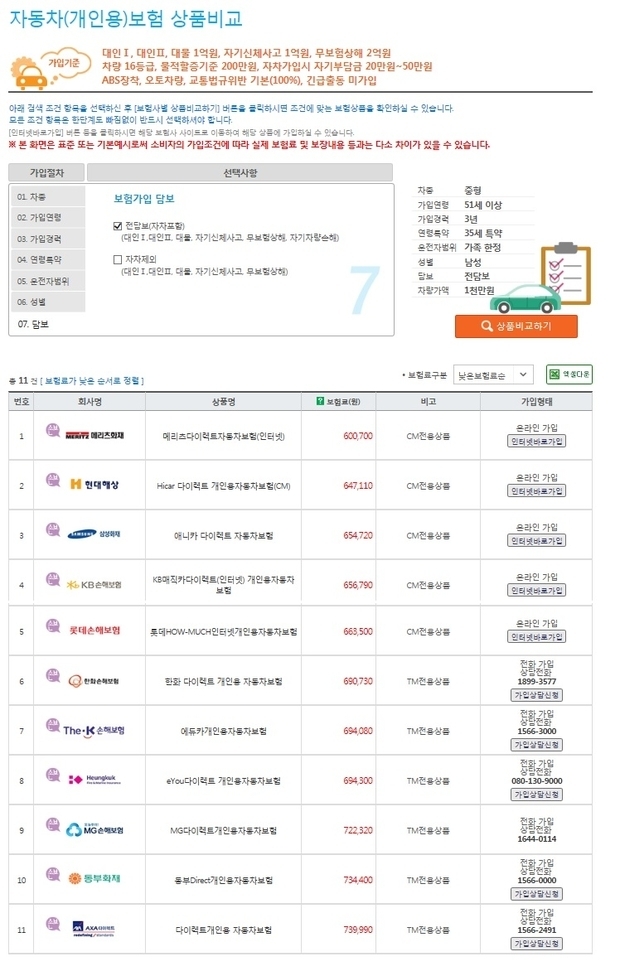 실제로 중형차를 보유한 51세 남성이 가입경력이 3년 이상, 35세 특약, 가족한정, 전담보로 자동차보험에 가입시 메리츠화재의 보험료가 600,700원으로 가장 낮았다, 이어 현대해상이 647,110원, 삼성화재가 654,720원으로 뒤를 이었다.