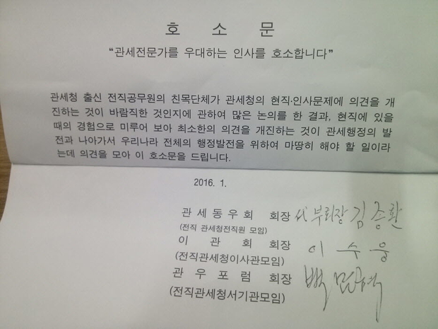 이들은 “관세행정은 전문분야이므로 기재부 등 외부인사가 관세청장이 되면 관세행정의 전용어를 익히는 데에 많은 시간이 소요되어 업무추진에 비능률을 초래한다”며 “앞으로는 관세청 내부의 관세전문가를 발탁해 (관세청장으로)임용해 줄 것을 9600여 전.현직 관세공무원은 간절히 희망한다”고 전했다.