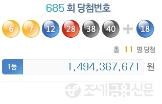 나눔로또 685회 당첨번호 6개를 모두 맞힌 1등 당첨자는 11명으로 14억9천436만원씩 받는다.