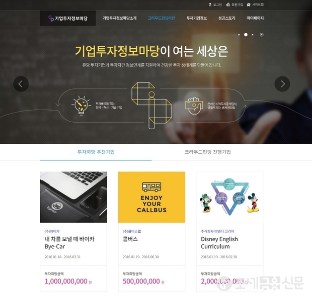 (조세금융신문=김사선 기자) IBK기업은행(은행장 권선주)은 투자를 희망하는 창업·중소기업과 증권형 크라우딩펀딩 중개업체 등 투자자를 연결해 주는 ‘기업투자정보마당(www.ciip.or.kr)’을 개설했다고 20일 밝혔다.