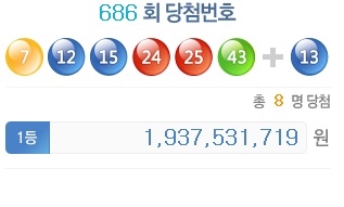 나눔로또 686회 당첨번호 6개 번호를 모두 맞춘 1등 당첨자는 8명으로 19억3753만원을 받는다.