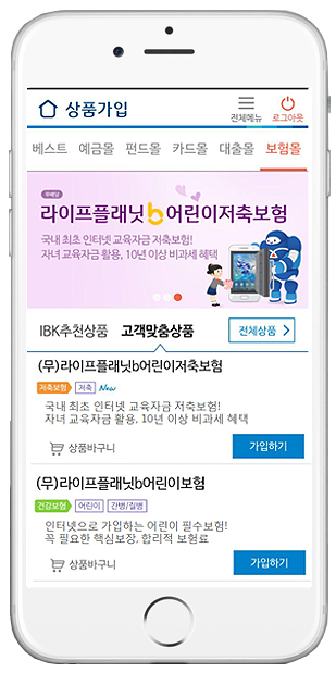 이 상품들은 IBK기업은행의 모바일앱인 'i-ONE뱅크'의 상품가입 메뉴인 '보험몰'에서 가입할 수 있다. 앱에 접속해 보험몰 내 관심상품을 선택한 후, 부모 및 자녀 생년월일과 성별을 입력하면 보험료 확인부터 가입까지 손쉽게 이용할 수 있다.