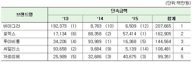뒤이어 또다른 발기부전 치료제인 씨알리스(정품가격 1084억 원), 까르띠에(정품가격 993억 원)가 각각 4, 5위를 차지했다.