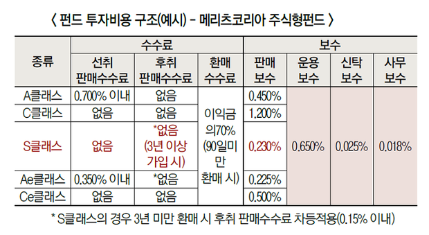 펀드에 투자할 때 클래스에 따라서 투자비용이 달라지기 때문에 어떤 클래스를 선택하는지가 중요하다. 특히 수수료는 일회성으로 한 번만 내면 되지만 보수는 펀드에 가입되어 있는 동안 계속 내야 하므로 가입금액이 늘어나고 투자기간이 길어질수록 증가하게 된다.