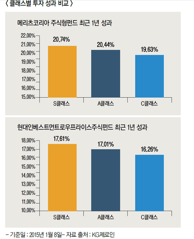 주식형 펀드 중 2015년 한 해 동안 투자자에게 인기를 모았던 메리츠코리아 주식형펀드와 현대인베스트먼트로우프라이스 펀드의 클래스별 성과를 살펴보면 투자비용 차이로 성과가 어떻게 달라지는지 직접 확인해볼 수 있다.