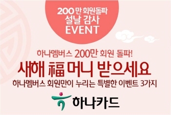(조세금융신문=김사선 기자) 하나카드(대표이사 정해붕)가 하나멤버스 200만 회원 돌파를 기념하기 위해 구정 연휴기간에 맞춰 하나머니 적립, 영화 시사회초청, 영화할인쿠폰 제공 등 다양한 이벤트를 진행한다고 4일 밝혔다.