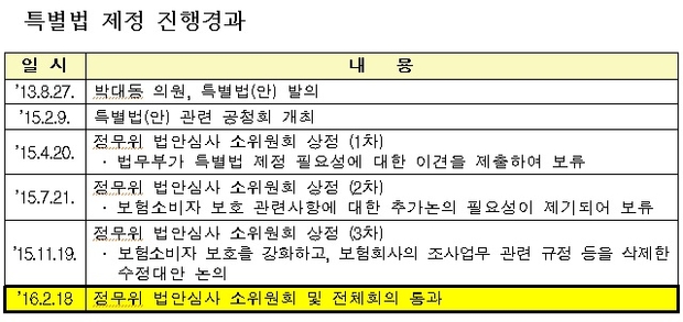 국회 정무위원회는 18일 법안심사소위원회를 열어 박대동 새누리당 의원이 2013년 8월 대표 발의한 보험사기방지 특별법을 의결했다.