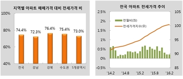 KB국민은행(은행장 윤종규 / www.kbstar.com)은 부동산 정보사이트 (http://nland.kbstar.com)를 통해 2016년 2월 전국 주택 매매 및 전세시장 동향을 조사 한 결과 2016년 2월 서울 아파트 전세가격 상승이 이어지면서 서울의 매매가격 대비 전세가격 비율(전세가율)이 74.2%로 나타났다. 이는 지난 달(73.8%)보다 0.4%포인트 상승한 것이다.