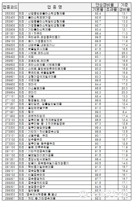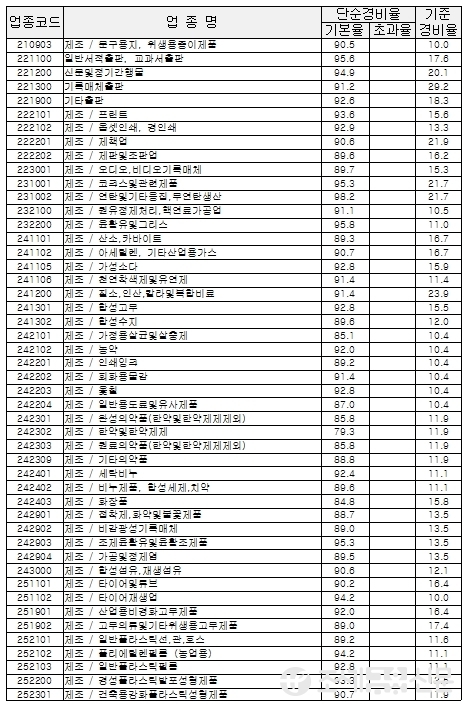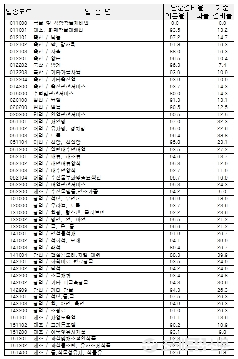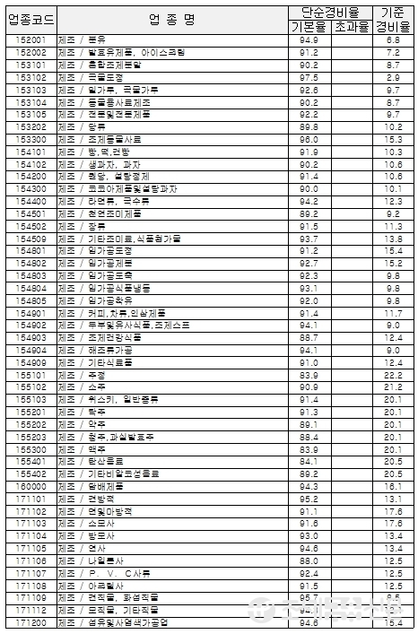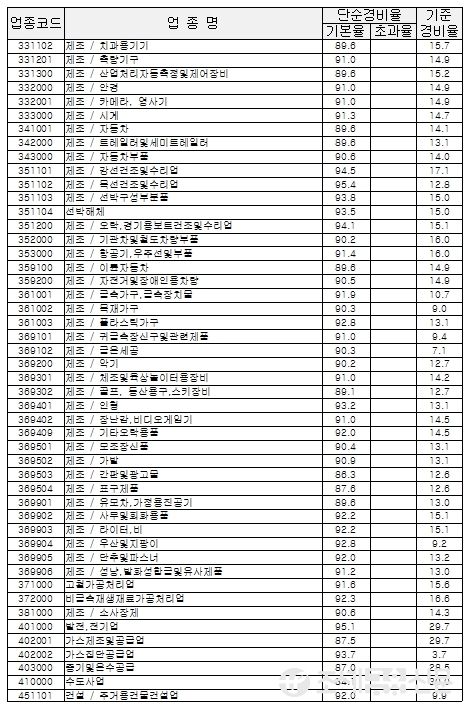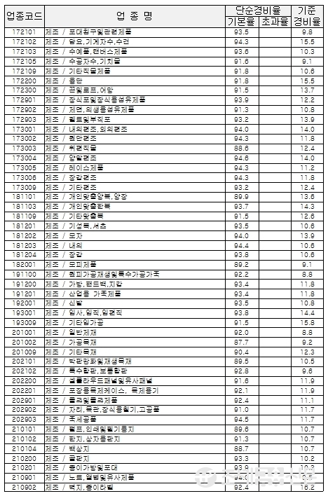 다음은 국세청이 고시한 업종별 경비율.