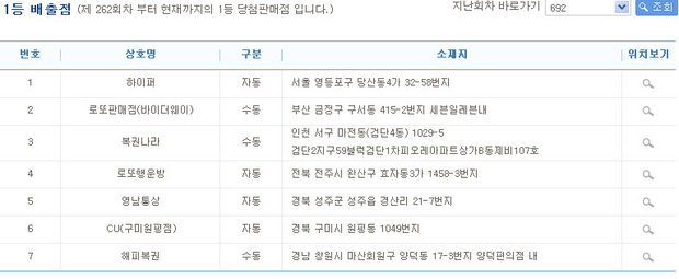 한편 로또 1등 지역별 당첨판매소는 경북에서는 성주군과 구미시 2곳과 서울, 부산, 인천, 전북 전주시, 경남 창원시가 각각 1곳씩이다.