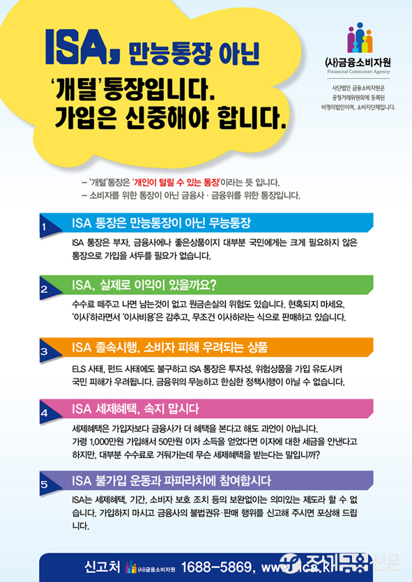 금융회사들의 가입자 유치 경쟁 과열로 불완전판매 우려가 커짐에 따라 소비자보호 대책 강화를 요구하며 ISA 판매 연기를 주장했던 '금융소비자원'은 ISA 불매 운동까지 선언하고 나섰다.