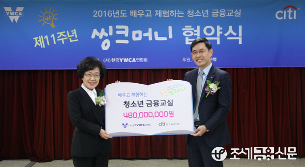 (조세금융신문=김사선 기자) 한국씨티은행(은행장 박진회, www.citibank.co.kr)은 한국YWCA연합회(회장 이명혜, www.ywca.or.kr)와 “배우고 체험하는 금융교실–씽크머니”의 열한번째 협약식을 3월 10일 오전 명동소재 YWCA강당에서 개최하고, 씨티재단(Citi Foundation) 후원금 4억8천여원(미화 40만 달러)를 전달했다.