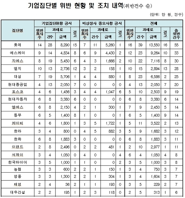점검 결과에 따르면 롯데그룹은 상장사의 위반건수(43건)와 비상장사의 위반건수(12건)가 모두 가장 많아 1억3550만원의 과태료를 맞았다.