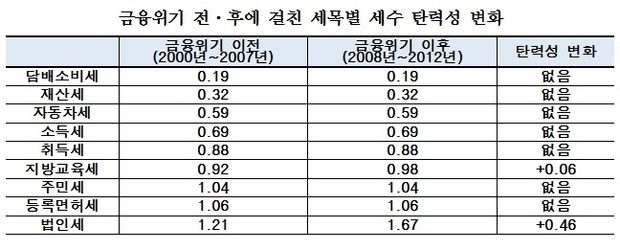 금융위기를 전후로 국세·지방세 중 법인세의 세수탄력성이 가장 크게 증가한 것으로 나타났다. 이는 법인세가 경기변화에 민감하게 반응한다는 의미다.