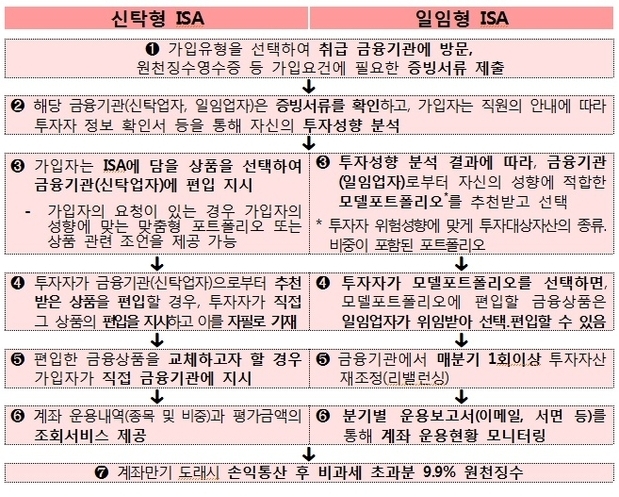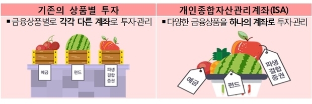 ISA (Individual Savings Account)는 예금, 펀드, 파생결합증권(ELS 등) 등 여러 업권의 다양한 금융상품을 한 계좌에 모아 투자하면서 계좌별 손익을 따져 200만∼250만원의 수익까지 비과세하는 받는 종합 자산관리 상품이다. 한도를 초과하는 수익에 대해선 기존의 15.4%에서 9.9%로 낮아진 세율로 분리 과세된다.