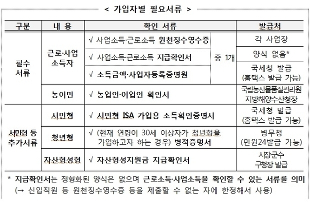 단, 서민형 ISA 가입을 위해서는 “서민형 가입용 소득확인증명서(국세청 홈택스(www.hometax.go.kr)에서 발급 가능)”가 필요하다.