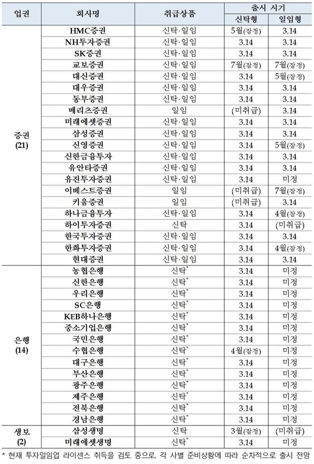증권사는 14일부터 신탁형과 일임형을 모두 팔 수 있지만, 은행은 우선 신탁형만 팔 수 있다. 은행은 이르면 내달부터 일임형까지 팔 수 있을 전망이다.