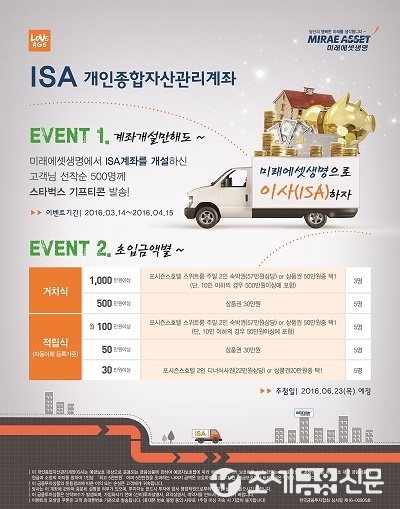 한편, 미래에셋생명은 ISA 출시에 맞춰 3월 14일부터 4월 15일까지 1달간 미래에셋생명 ISA에 가입한 고객에게 선착순으로 스타벅스 커피 기프티콘을 발송하며, 가입조건별로 20~50만원 상당의 경품을 증정하는 이벤트를 진행한다.