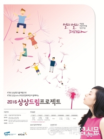 (조세금융신문=김사선 기자) KT&G(사장 백복인)가 한국장학재단과 함께 대학생 꿈 실현 프로그램인 ‘2016 상상드림프로젝트’의 참가자를 오는 4월 17일까지 모집한다.