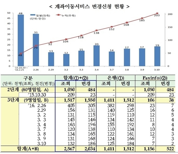 3단계 시행 2일차부터 8영업일간 일평균 조회 14만명, 변경 16만건 수준을 꾸준히 유지하고 있는 것으로 나타났다.
