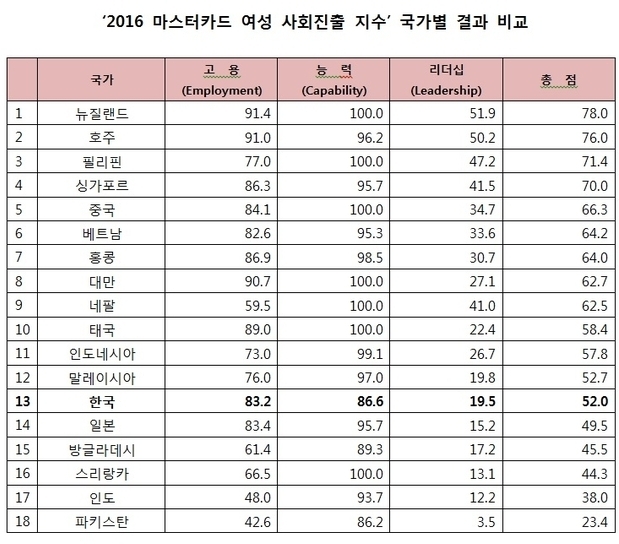 마스터카드가 아시아태평양 지역 18개국 여성의 남성대비 사회경제적 지위를 수치화해 비교 및 분석한 ‘2016 마스터카드 여성 사회 진출 지수(MasterCard Index of Women’s Advancement)’에 따르면 한국은 작년 대비 0.3점 상승한 52점을 기록, 전체 18개국 중 13위에 올랐다.