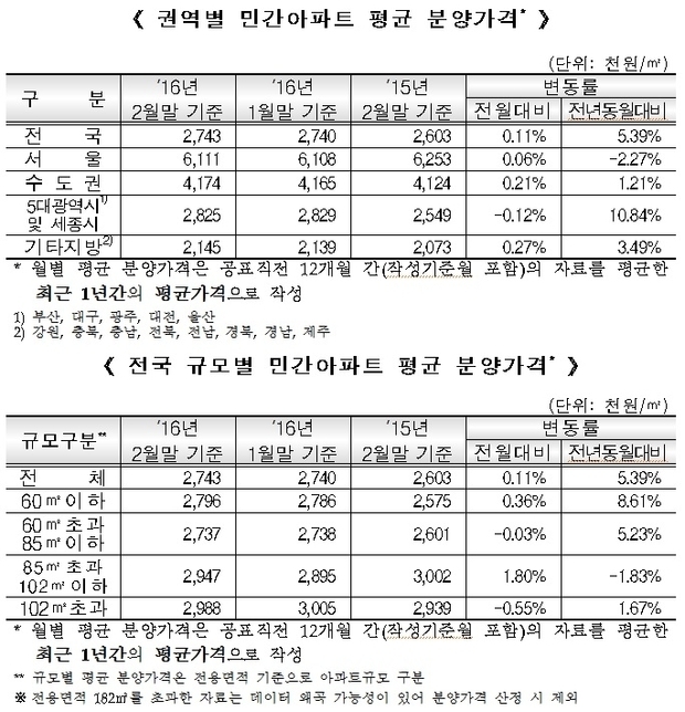 수도권(0.21%)과 기타지방(0.27%)의 평균 분양가격은 전월대비 상승한 반면, 서울(0.06%)은 보합, 5대광역시 및 세종시(-0.12%)는 하락한 것으로 조사되었다.