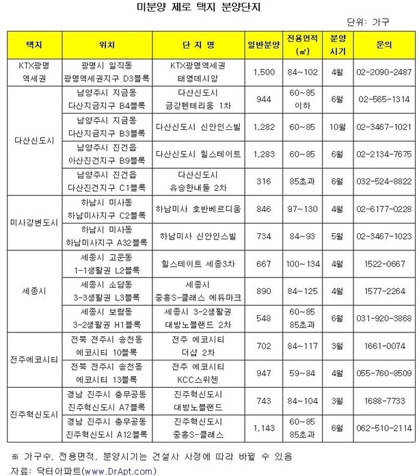 건설부동산업계와 닥터아파트(www.DrApt.com)에 따르면 미분양이 없는 택지는 대부분 공공택지다. 수도권에선 KTX광명역세권지구, 하남 미사강변도시, 남양주 다산신도시 등이 있다.