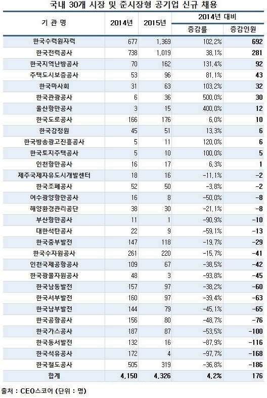 16일 기업 경영성과 평가사이트인 CEO스코어(대표 박주근)가 국내 30개 시장 및 준시장형 공기업의 작년 신규 인력 채용 실태를 조사한 결과 총 4326명으로 전년(4150명)보다 4.2%(176명) 증가한 것으로 조사됐다.