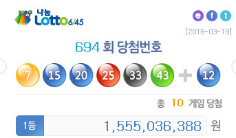 (조세금융신문=양학섭 기자)나눔로또 제694회 로또복권 추첨에서 ‘7, 15, 20, 25, 33, 43’번이 1등에 당첨됐다. 2등 보너스 번호는 ‘12’번이다.