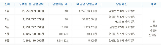 당첨번호 6개를 모두 맞힌 1등 당첨자는 총 10명으로 15억5503만원씩 받는다. 1등 당첨자 10명 중 수동선택이 6명으로 60%를 차지했다.