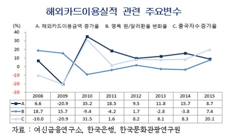 여신금융협회 임윤화 연구원은 '메르스 사태 종결로 2016년 비거주자의 국내카드이용금액은 다시 상승추세를 이어갈 것'으로 전망했다.
