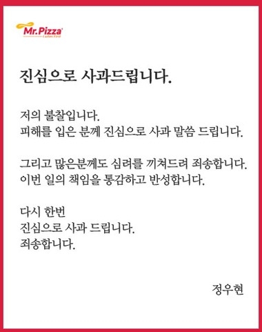 (조세금융신문=최일혁 기자) 경비원 폭행으로 여론의 뭇매를 맞고 있는 정우현 MPK그룹 회장이 4일 대표 브랜드인 미스터피자 공식 홈페이지에 팝업창으로 사과문을 띄웠다.